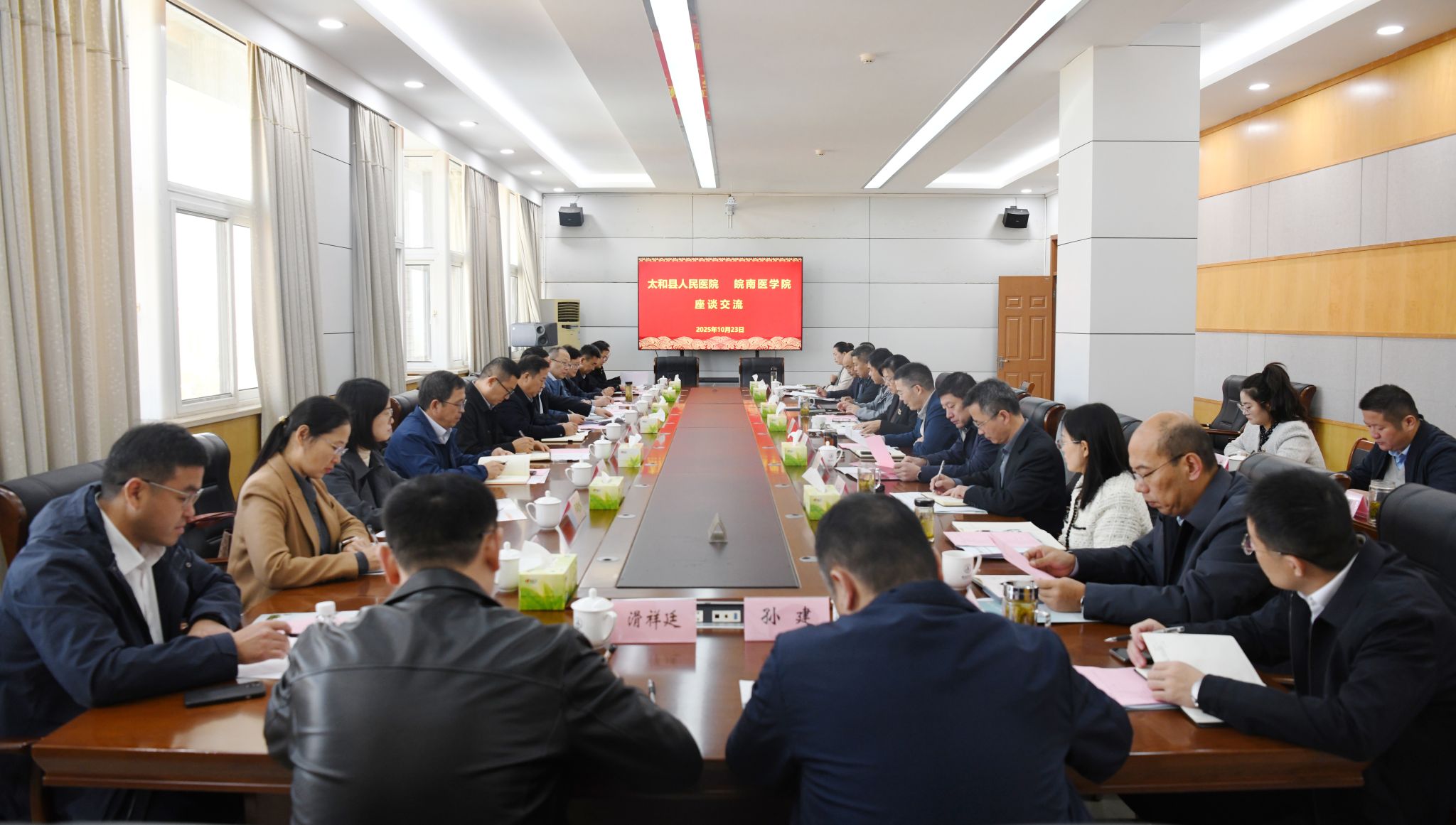 10月23日上午,太和县卫健委党组书记、主任、附属太和医院党委书记李震,党委副书记、院长赵曙光率医院党政领导班子及相关职能科室负责人来校,就进一步推进校院深度融合开展座谈交流。校党委书记夏劲松,党委副书记、院长姚应水,党委常委、纪委书记、监察专员王保中,党委常委、副院长韩永升、田磊、余结根在校党委会议室热情接待来访嘉宾。座谈会由余结根主持。