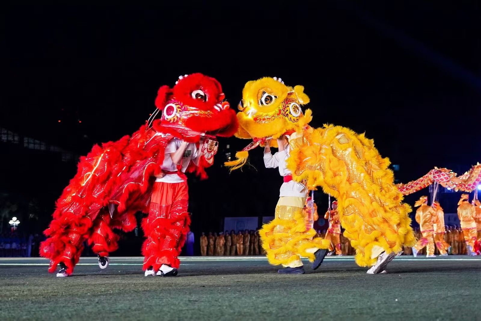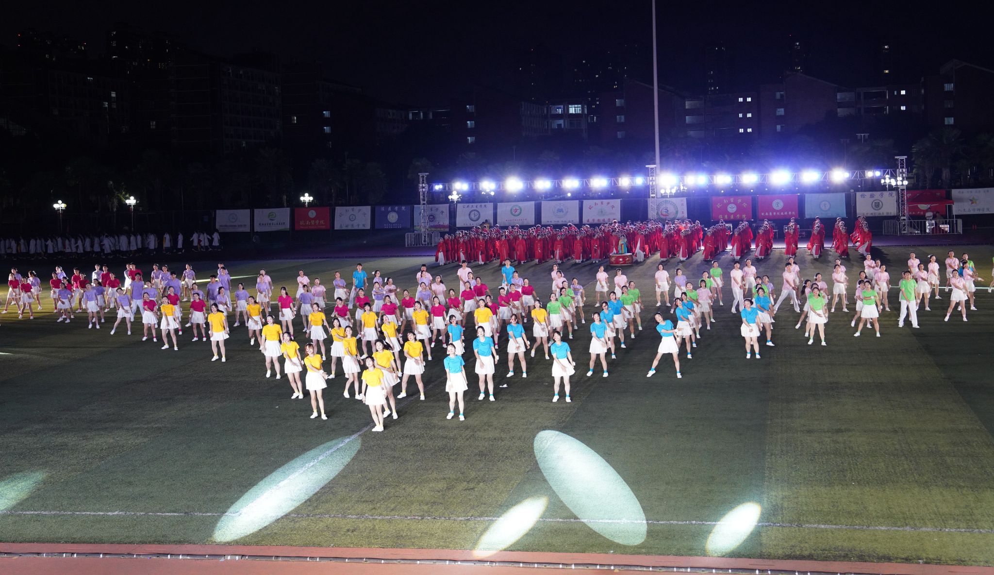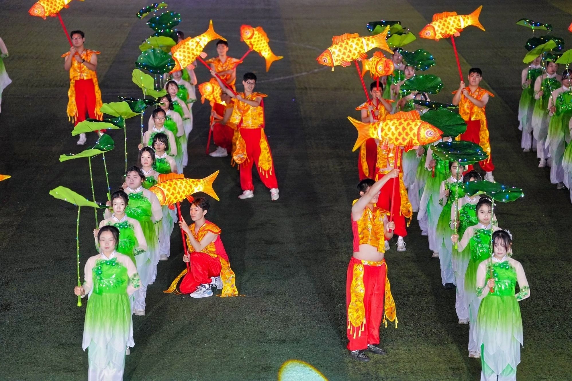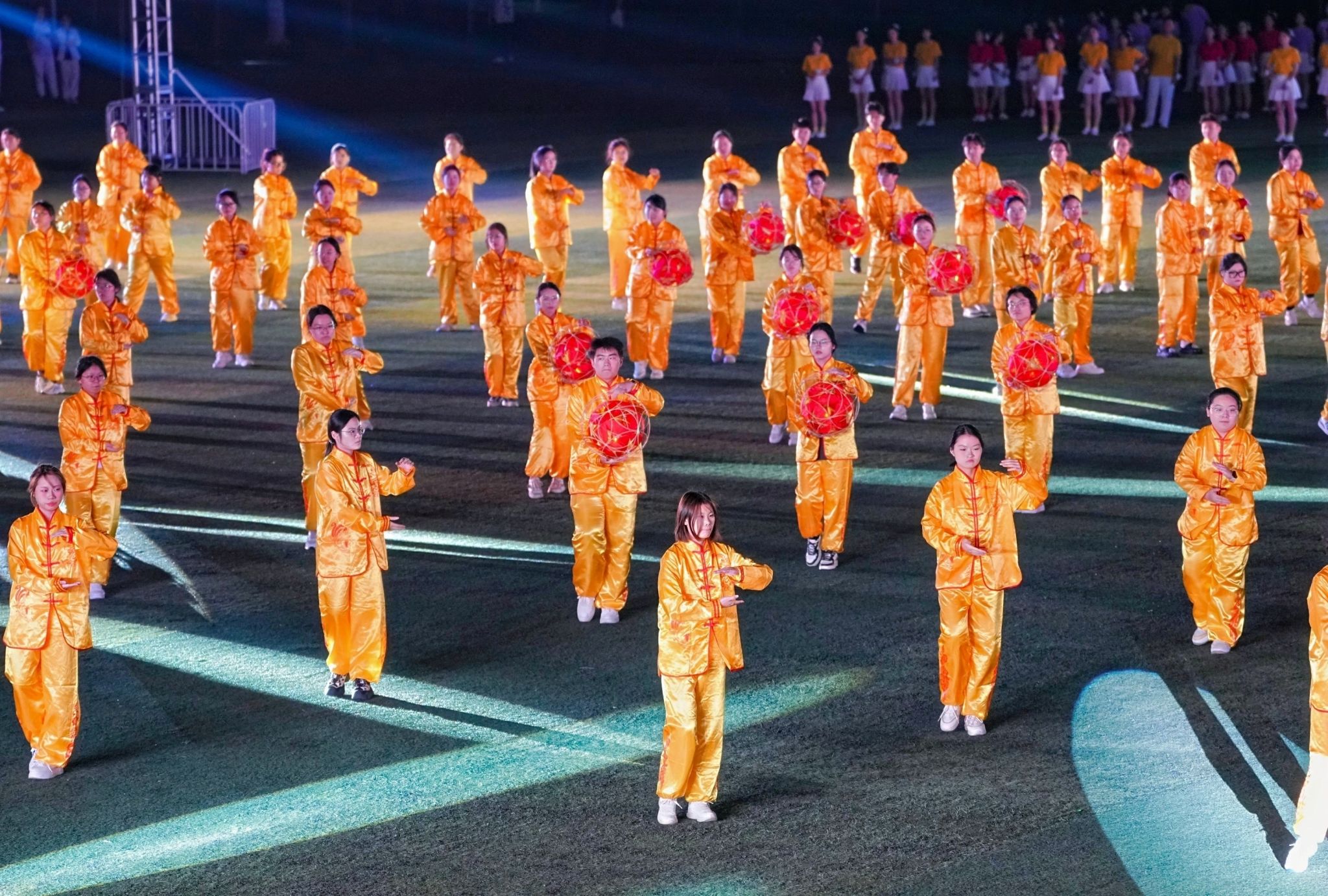 流光溢彩展风采,凝心聚力谱华章。今年的开幕式与往年不同,精彩纷呈、声势浩大的文艺表演配合绚丽的舞台、璀璨的灯光,给师生带来了一场美轮美奂的视觉盛宴。文艺汇演以《祥龙瑞狮》拉开序幕,表演者以矫健的身姿、灵动的表演展现了中华传统文化的魅力和团结奋斗、勇往直前的精神;非遗表演《鱼跃龙门》中,各只小鱼在表演人员的舞动下,时而聚拢,时而嬉戏,穿梭在荷叶之间,表达了对学子们学业有成的美好祝愿和对医学事业的孜孜追求;《非遗之光》将滚灯与太极拳相结合,动静相宜,在一招一式中尽显医学生内外兼修、刚柔并济的精神面貌;舞蹈表演《同爱同在》活力四射、朝气蓬勃,充分彰显了青年学子对医学事业的热爱和挑战自我、积极进取的奋进姿态;《大雅国风》深情致敬传统文化,在坚定文化自信中谱写新时代青年的青春答卷;《旗开得胜》表演者高举旗帜、振臂挥舞,展现了皖医学子无畏困难、勇往直前的青春风采;离退休老同志带来的扇子舞表演《祝福祖国》,用手中的彩扇编织成祖国万岁的图案, 表达了老同志对祖国的无限深情和对美好生活的热爱。运动场上,灯火献礼,璀璨夺目,不仅点亮了皖医的夜空,更照亮了新征程的道路。